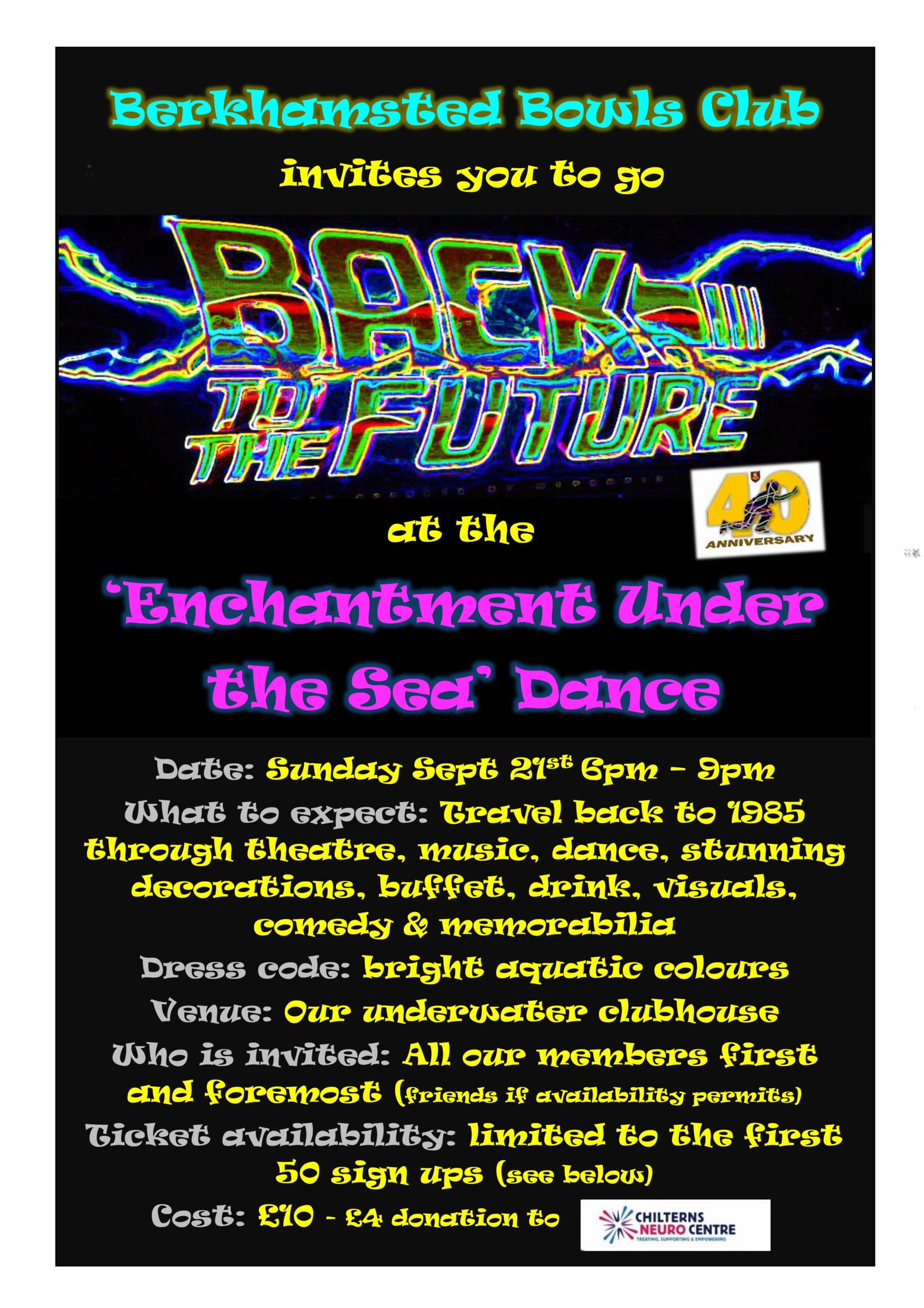 ‘The Enchantment Under The Sea’ dance was a scene from the blockbuster film Back To The Future starring Michael J Fox who was diagnosed with Parkinsons at a young age and has been a hero for many fellow Parkinson sufferers. The Chilterns Neuro Centre which supports people with MS, Parkinsons & Strokes will benefit from your attendance as £4 of your £10 will be donated to this very important organisation at Wendover.