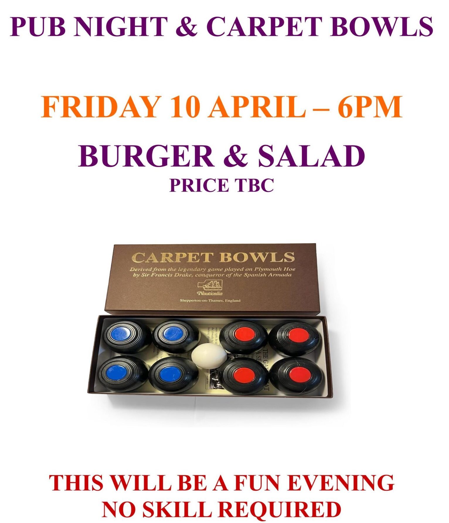 The last event of the winter season will be a Pub Night with Carpet Bowls plus Burgers & Salad on the above date.